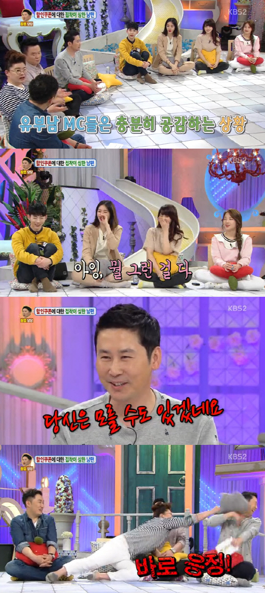 이에 MC 김태균과 신동엽은 "알뜰한 건 좋은데 그 순간엔 너무 했다", "그런 행동은 아내로써 자존심 상하는 행동이다"라고 놀라워했다.