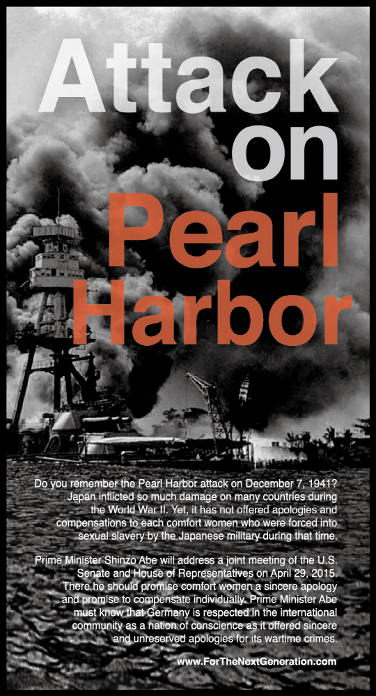 NYT,WSJ,WP 등 미국 주요 신문에 일본의 역사 왜곡 시리즈 광고를 지속적으로 게재했던 한국 홍보 전문가 서경덕 성신여대 교수가 이번에는 일본 아베 총리의 미국 의회연설에 맞서 28일자(현지시각) NYT에 '진주만 폭격' 광고를 게재했다.