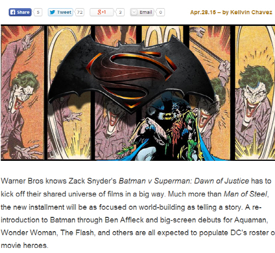이미 DC에서 내년 8월 개봉 예정인 '수어사이드 스쿼드'에는 조커 역으로 할리우드 배우 자레드 레토가 캐스팅된 것으로 알려졌다. '수어사이드 스쿼드'는 악당들을 대상으로 비밀리에 만들어진 팀을 의미하며 데드샷 역에 윌 스미스, 렉스 루터 역에 제시 아이젠버그가 캐스팅된 것으로 알려졌다. 또 '수어사이드 스쿼드' 캐나다 토론토 촬영장에 '배트맨 대 슈퍼맨'에서 배트맨 역할을 맡은 벤 애플렉이 나타났다는 소문까지 돌며 레토 역시 '배트맨 대 슈퍼맨'에 출연하는 것이 아니냐는 예상이 나오는 것.