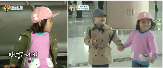 KBS2 '슈퍼맨이 돌아왔다'의 사랑이는 오랜만에 만난 만세를 위해 핑크 컬러 가득한 러블리 룩을 선보였어요. 양쪽에 헬로키티가 그려진 맨투맨 티셔츠를 입은 모습이 무척 귀엽네요. 이에 화이트 컬러 도트무늬가 돋보이는 스냅백을 매치하여 트렌디한 핑크 힙걸로 변신! 햇츠온 키즈의 제품. 품번은 SMBSNG0114OR, 가격은 4만 9,000원입니다. <스포츠조선 연예패션팀>