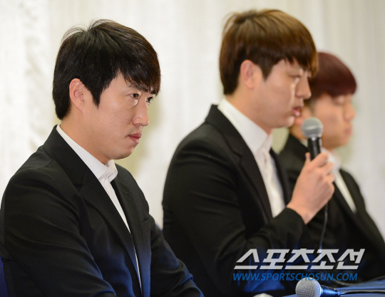 장동민이 옹달샘 멤버인 유세윤, 유상무와 함께 긴급 기자회견을 열었다. 28 오후 서울 상암동 스탠포드 호텔 그랜드볼룸에서 장동민, 유상무, 유세윤이(왼쪽부터) 침통한 표정으로 사죄 기자회견을 하고 있다. 장동민 유세윤 유상무를 비롯한 옹달샘 멤버들은 과거 팟캐스트 진행 중 했던 막말들이 최근 논란이 되며 많은 비난을 받았다. 정재근 기자 cjg@sportschosun.com/2015.04.28/ |