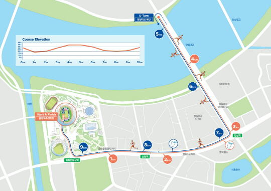 다운힐 덕분에 6Km까지는 쉽게 내달릴 수 있었다. 곧 7Km지점. 잠실대교를 벗어나 잠실역을 지났다. 이른 아침이지만 지나가는 행인들이 응원을 보내주기도 하고, 마라톤 주최 측에서 준비한 '겨울왕국'의 엘사나 여러 인기 영화 속 캐릭터들도 곳곳에 등장해 참가자들을 응원한다. 민망할 수도 있는 코스프레를 바라보며 참가자들 사이 "혹시 뉴발란스 신입직원은 아닐까?"라는 목소리도 들려왔다.