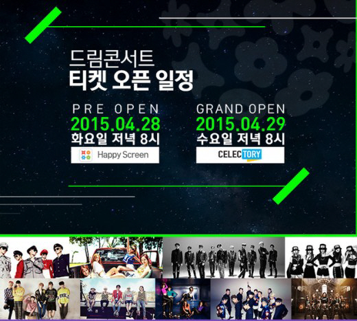 드림콘서트 티켓은 28일은 모바일 해피스크린 앱을 통해 발매하며, 29일에는 SPC에서 운영하는 셀렉토리 모바일 웹사이트를 통해 구매할 수 있다.