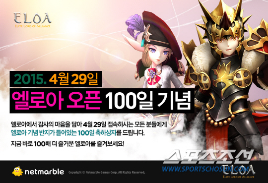넷마블은 '엘로아' 서비스 100일째를 맞는 29일 게임에 접속 후 출석 확인을 한 이용자 전원에게 '100일 기념 반지', '에바의 숨결', '에바의 눈물' 등 다양한 게임 아이템으로 구성된 '엘로아 100일 축하 상자'를 선물한다.