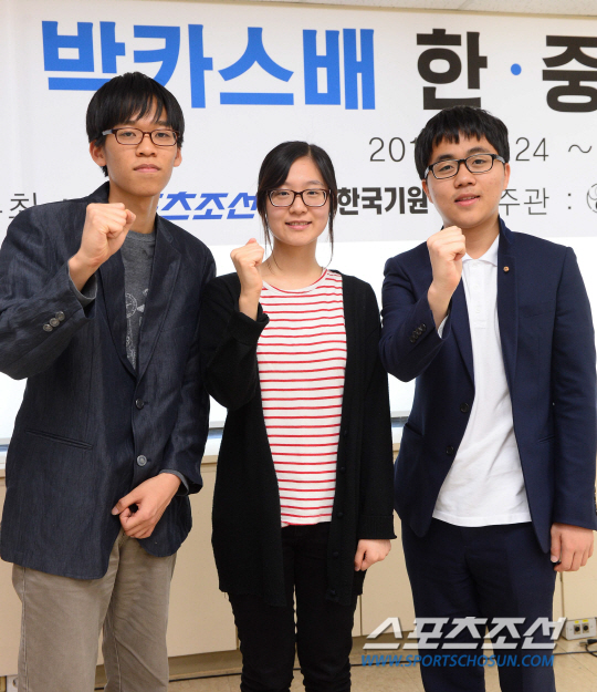 ◇2015 한·중 바둑 미래 천원전 국내 대표로 선발된 백찬희 초단, 오유진 2단, 신민준 2단(왼쪽부터)이 파이팅을 외치고 있다. 이들 3명의 기사는 랭킹 시드를 받은 이동훈 5단, 신진서 2단과 함께 오는 6월 중국 상하이에서 열리는 본 대회에 참가한다. 최문영 기자 deer@sportschosun.com