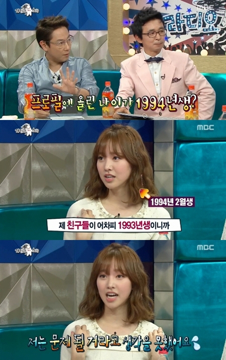 이날 MC들은 진세연이 데뷔 당시 포털사이트 프로필에 올린 출생연도가 1993년생이었다고 말했다.