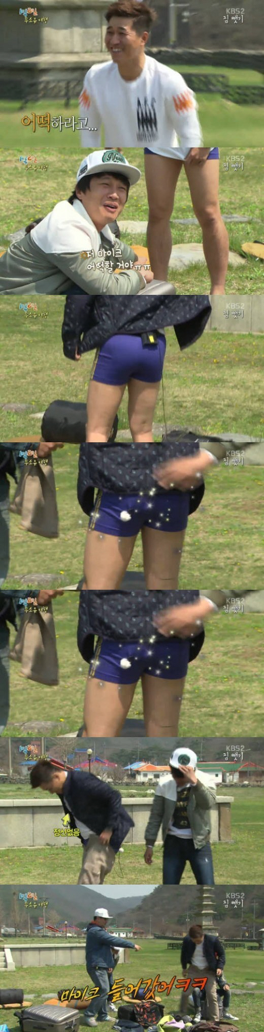 특히 김준호는 데프콘이 팬티만 입은 김종민을 가려주고 있자 데프콘을 밀어냈다. 이에 김종민은 급하게 상의를 밑으로 내렸다. 이때 차태현은 김종민이 하의를 벗은 탓에 마이크가 갈 곳을 잃은 것을 보고 마이크를 팬티에 걸어 웃음을 자아냈다. <스포츠조선닷컴>