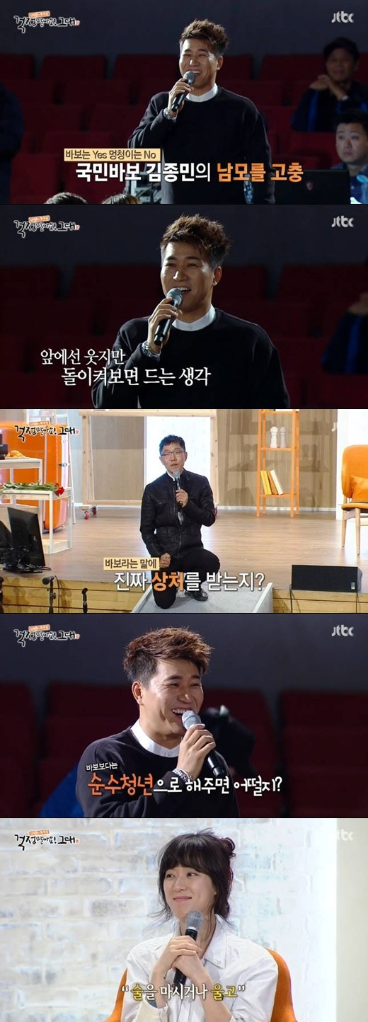 이에 김제동은 "정말 큰 상처가 되냐?"고 물었고, 김종민은 "순수청년 정도로 불러주면 좋을 것 같다"고 답했다.