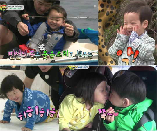 이날 방송에서는 네 가족의 2박 3일 제주도 여행 두 번째 이야기가 그려졌다. 아빠와의 바다 낚시에 나선 삼둥이 대한 민국 만세, 문어와 해삼의 촉감에 눈을 빛내는 이휘재 쌍둥이 서언 서준, 친구들과 언니 오빠를 만나 활발해진 '미소천사' 엄지온, 남다른 '애정 케미'를 보인 추사랑-송만세의 모습 등이 보여지며 청정 미소를 짓게 했다.