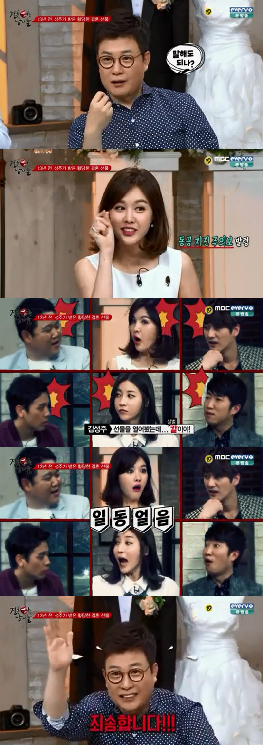 3일 방송된 MBC 에브리원 '결혼 터는 남자들'에서 김성주는 13년 전에 받은 황당한 결혼 선물에 대한 일화를 털어놨다.