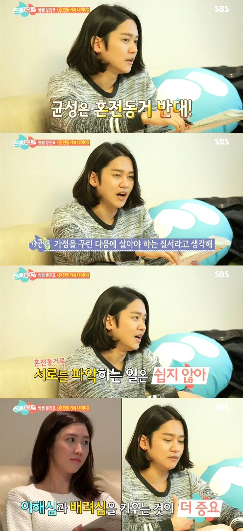 강균성은 "동거를 하면 뭔가 시험당하는 느낌"이라며 "개인적으로 혼전 동거에 반대한다"고 말했다. 이에 대해 서인영은 "혼전 동거를 나쁘지 않다고 생각한다"며 "결혼이 전제됐다면 긍정적으로 본다"고 반대 의견을 드러냈다.