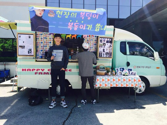 공개된 사진 속에는 '앵그리맘' 촬영 현장에 선물한 커피차 앞에서 미소 짓고 있는 지수의 모습이 담겼다.