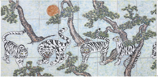 800도에서 초벌 작업을 한 도자 위에 그림을 그리고 유약을 바른 뒤 다시 1300도 가마의 열로 구워낸다. 도자라는 캔버스 위에 과감한 구도와 힘 있는 필치, 화려한 색채감으로 한국인의 일상적인 미의식을 한껏 드러낸다. 여기에 꿈과 이야기가 있는 민화의 상징성을 강하게 표현해 차가우면서도 열정적이고 호방하면서도 사랑스러운 자신만의 예술세계를 완성했다. 민화의 전통 위에서 자신만의 창의성을 가미한 것. 이번 전시에서는 대표작인 '소나무와 호랑이'를 비롯한 도자기 페인팅 작품 60여 점을 만날 수 있다.