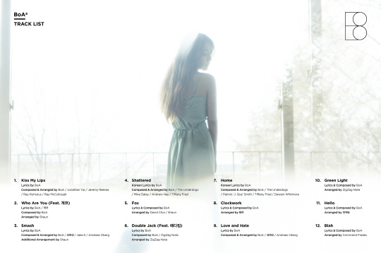 8일 오전 공식 홈페이지(http://boa.smtown.com), 페이스북 SMTOWN 페이지 등을 통해 공개된 새 앨범 'Kiss My Lips'(키스 마이 립스)의 트랙리스트에는 타이틀 곡 'Kiss My Lips'와 음원 차트 1위에 빛나는 선공개곡 'Who Are You'(후아유)를 포함한 총 12곡으로 구성, 보아의 음악적 감성과 재능을 한껏 느끼기에 충분하다.