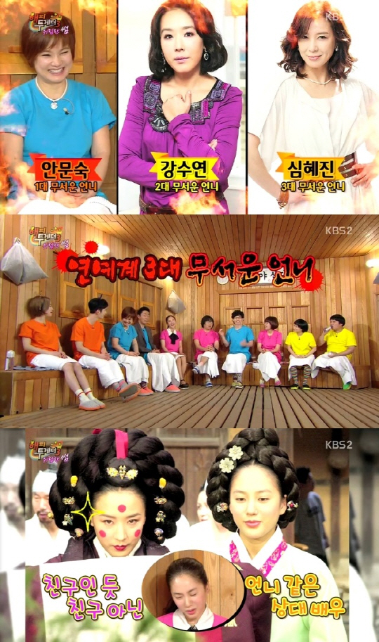 박주미는 "내가 무서워하는 언니들이 있다. 안문숙 강수연 심혜진이다"며 "강수연은 영화계 대선배긴 하지만 드라마 촬영을 할 때 친구로 나왔다. 근데 친구 같지않은 친구였다"고 귀띔해 좌중을 폭소케 했다.