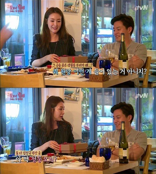 이서진은 8일 방송된 tvN '꽃보다 할배' 그리스편 마지막회에서 제작진이 "최지우와 함께 보라"라며 선물을 건네자 "혹시 원앙 아니냐"라며 웃었다.