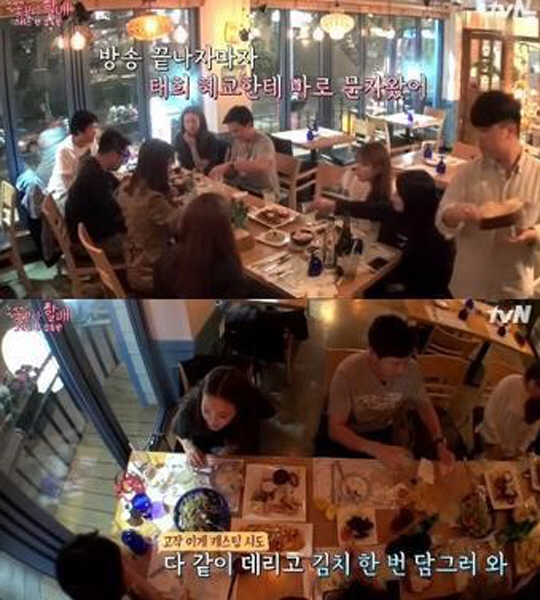 8일 tvN "꽃보다할배-그리스 편' 마지막 회에서는 그리스 여행이 끝난 뒤 이태원 그리스음식점에서 만난 짐꾼 최지우-이서진의 모습이 방송됐다. 이서진과 최지우, 그리고 나PD를 비롯한 제작진들은 여행을 반추하며 즐거운 시간을 보냈다.