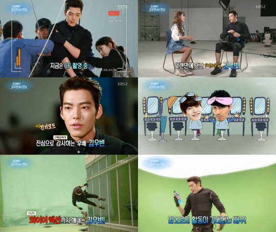 '대체불가 파워 아이콘' 김우빈이 자신감과 열정 넘치는 태도로 와이어 액션을 선보이는 모습이 16일 KBS2 '연예가중계'를 통해 공개 되었다.