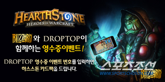 블리자드 엔터테인먼트는 프랜차이즈 커피전문점 카페 드롭탑(DROPTOP)과 함께 드롭탑 제품 구매 시 블리자드의 첫 스마트폰 게임인 하스스톤: 워크래프트의 영웅들의 카드팩을 무료로 받을 수 있는 '하스스톤 카드팩 증정 이벤트'를 6월 7일까지 진행한다고 밝혔다.