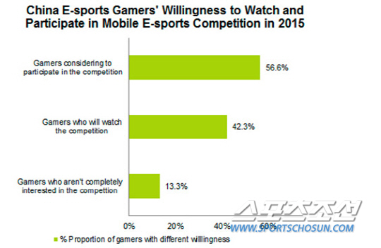 최근 중국의 리서치전문기관 아이리서치(i-research)에 따르면, 중국의 이스포츠 관람자 중 56.6% 유저들은 대회에 직접 참여하기를 원하고 있으며, 42.3%의 유저들은 모바일게임 시합 관람에 흥미를 가지고 있다고 발표했다.