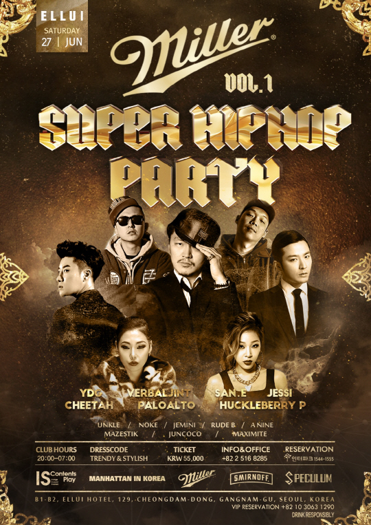 한편, '2015 밀러 슈퍼힙합파티(2015 MILLER SUPER HIPHOP PARTY)'는 오는 6월 27일 오후 8시 강남 클럽 '엘루이'를 시작으로 7월 10일 부산 그리드 클럽 외 2~4개 지역에서 공연이 진행될 예정이다. 12일 인터파크를 통해 오후 2시 얼리버드 티켓 오픈되며, 오는 19일 1차 정식 티켓 오픈할 예정이다. 공연 티켓은 인터파크(1544-1555), YES24(1544-1555)를 통해 예매 가능하다.