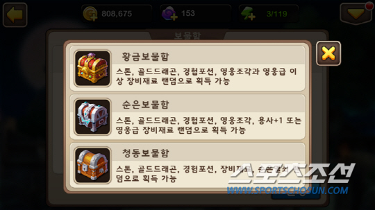 보물함에서는 게임내 재화는 물론 경험치 물약과 골드드래곤, 캐시까지 드랍해 보상이 제법 큰 편이다. 특히 가장 최상급인 황금 보물함에서는 영웅 조각과 영웅급 장비도 나와 40레벨까지 전진하는데 큰 도움을 준다.