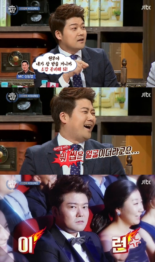 유세윤은 "제일 막강한 후보는 전현무다. 작년에 본인이 상 탄다고 하지 않았냐"고 물었고, 전현무는 "아 그 상이구나. 그 때 시상식에 가 있었는데 못 받았다. MC가 신동엽이었는데 상 받을 거니까 준비하라고 하더라. 수상소감을 준비했는데 다른 사람이 타더라. 화면 속 내 얼굴을 보니 뭐 씹은 얼굴이더라"고 말해 웃음을 자아냈다.