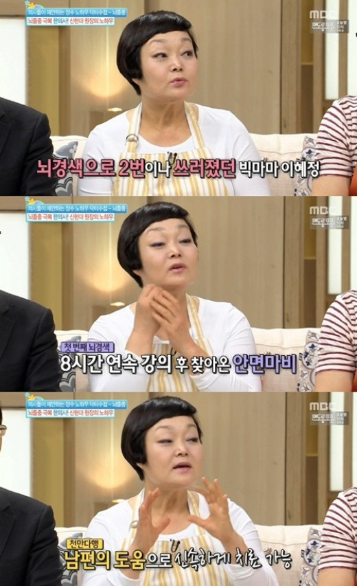 이날 방송에서 이혜정은 "뇌경색으로 2번이나 쓰러졌었다"며 "8시간 연속 강의를 끝내고 난 뒤였다. 침을 흘리고 있었다고 하더라"라고 언급했다.