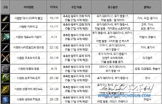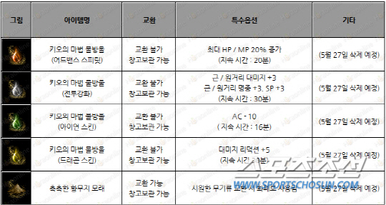 이번 이벤트 아이템들은 이벤트가 종료되는 시점인 오는 5월 27일 회복제, 버프 마법, 시원한 무기 등 모두 삭제될 예정이다.