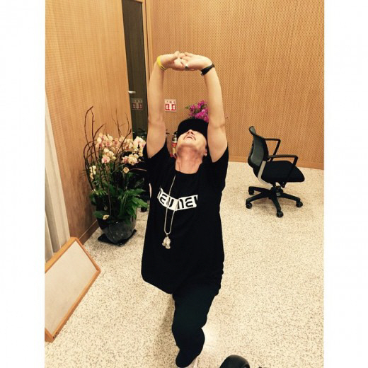 또 다른 사진에서는 방송 직전 스트레칭으로 유연함을 뽐내고 있는 산이의 모습이 담겨 웃음을 자아낸다.
