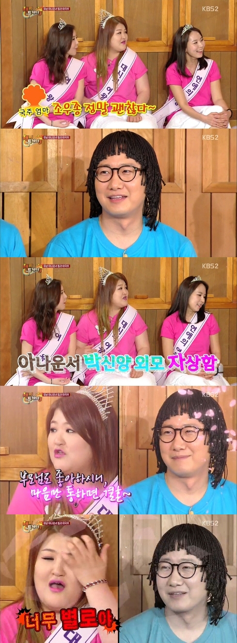 이날 이국주는 "6~7년 전에 가족들 나와서 노래 부르는 코너가 있었다. 그날 엄마, 동생과 내가 나가 노래를 불렀다. 엄마가 옆에서 조우종을 보며 정말 괜찮다고 했다. 약간 박신양 닮은 외모에 아나운서고 자상하다고 사람을 찔렀다"며 과거를 회상했다.