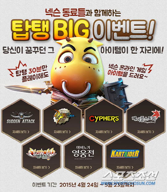 탑오브탱커가 넥슨의 온라인게임 7종과 제휴 이벤트를 진행 중이다. 넥슨은 오는 5월 23일까지 탑오브탱커의 일정 레벨을 달성하면 서든어택, 던전앤파이터, 사이퍼즈, 메이플스토리, 엘소드, 마비노기영웅전, 카트라이더의 아이템을 제공한다.