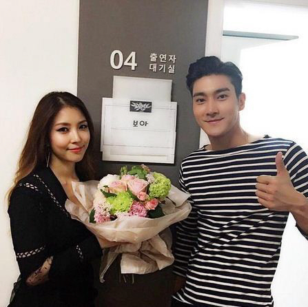 공개된 사진 속에서 최시원은 보아와 함께 KBS2 '뮤직뱅크' 대기실 앞에서 다정한 모습을 취하고 있다.