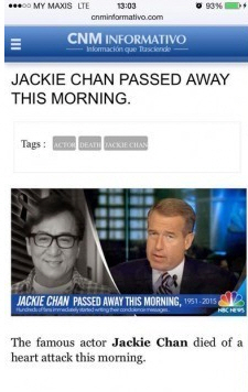 또 한번 퍼진 사망 루머에 본인이 직접 나섰다. 청룽은 15일 오후 자신의 웨이보에 "오늘 비행기에서 내리자마자 두 가지 뉴스를 받았다. 정말 어쩔 수 없구나!"라며 어이 없다는 듯한 체념의 메시지를 남겼다. 나란히 '청룽이 오늘 아침 사심장마비로 망했다'는 CNM 뉴스 캡처 사진을 게재했다. 하지만 이는 사실이 아닌 합성으로 추측되고 있다.