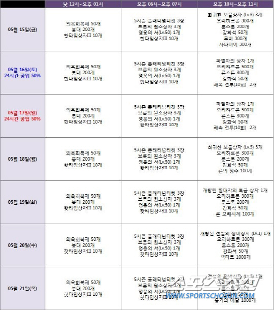이와 함께 인게임 내에서는 5월 15일부터 오는21일까지 안미스터리 영웅쇼! 복면영웅 이벤트가 진행된다. 인게임 내 팝업으로 나오는 '복면 영웅의 이름을 유추'하여 쿠폰명의 빈칸을 완성하는 것으로 그 날의 복면 영웅을 6성부터 ~ 전설 영웅가지 획득할 수 있는 '프리미엄 티켓'을 증정한다. 첫 날 이벤트 쿠폰명은 "알레나모를레나"로 쿠폰란에 입력 시 프리미엄 알레나 쿠폰을 지급받을 수 있다.