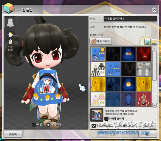 이것으로 끝이 아니다. 패션의 완성은 의상이다. 물론 '메이플스토리2'에 이미 준비되어 있는 의상도 다채롭고, 충분히 귀엽다. 그래도 이것조차 질렸다면 의상을 아예 자신이 직접 만들 수도 있다. 게임 내에서 옷 본을 구입해 미리 준비된 그림 파일을 입히면 끝이다. 좋아하는 캐릭터 그림이나, 연예인 사진을 옷에 넣어 입고 다닐 수 있다. 다른 사람이 만든 의상을 게임머니로 구입할 수도 있다.