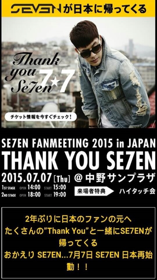 가수 세븐(최동욱)이 오는 7월 7일 제대 후 첫 일본 팬 미팅 'Thank you SE7EN'을 연다.