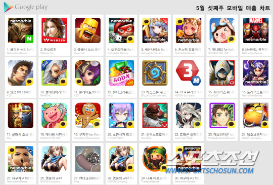 구글 플레이 스토어 매출 차트를 상세하게 살펴보면 상위권 게임은 대부분 자리를 유지한 가운데 넷마블게임즈의 '몬스터길들이기'가 6위로, '마블 퓨처파이트'가 8위로 소폭 오르면서 상승세를 달렸다.
