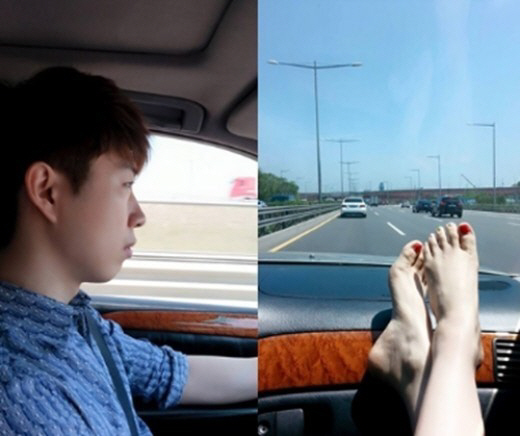 공개된 사진 속 임요환은 운전 중이며, 김가연은 자동차 대시보드에 발을 올리고 앉아 있다.