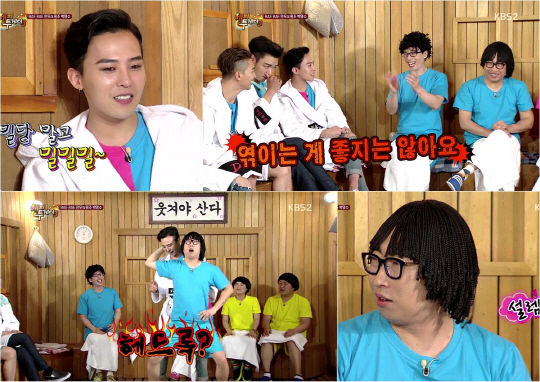 21일 방송된 KBS2 '해피투게더3'는 빅뱅 특집으로 꾸며졌다. 7년 만에 KBS 예능 출연을 감행한 빅뱅은 재치있는 입담과 몸 사리지 않는 개인기를 선보였다. 특히 지드래곤과 박명수는 흥미진진한 밀당을 시전했다. 지드래곤은 "배배 포인트 안무는 사실 명수형과 준하형의 불장난 댄스를 보고 영감을 얻었다"고 밝혔다. 박명수는 "저한테 허락 안 맡고 쓰신 거에요?"라고 도발했다. 이에 MC들은 지드래곤과 박명수의 불장난 댄스를 추천했다. 하지만 지드래곤은 "자꾸 엮이는 거 좋아하지 않아요"라고 거부, 박명수를 당황시켰다. 박명수는 "지드래곤 울렁증이 있다"며 출구 없는 '지디 앓이'를 ㅂ여 웃음을 자아냈다.