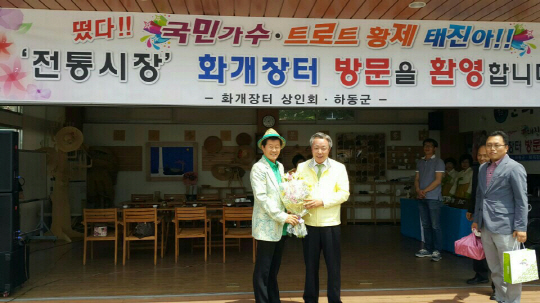 최근 강남과 듀엣 곡 '전통시장'을 발표, 인기몰이 중인 태진아는 22일 경상남도 하동 화개장터를 찾아 상인들을 응원하고 서민경제 살리기에 앞장섰다.