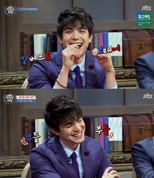 JTBC '비정상회담' 44회에서 프랑스 미남 로빈은 청량한 네이비 색감이 돋보이는 수트재킷을 착용했습니다. 미세한 화이트 스트라이프 라인이 트렌디한 느낌을 줍니다. 로빈은 비슷한 계열의 타이를 매치하여 룩의 통일감을 주었네요. 셔츠 역시나 옅은 스카이블루 색상으로 선택하여 시원하고 댄디한 느낌의 수트 룩을 완성했습니다. 프롬의 제품. 품번은 R51M-JK062A, 가격은 11만원대입니다. <스포츠조선 연예패션팀>