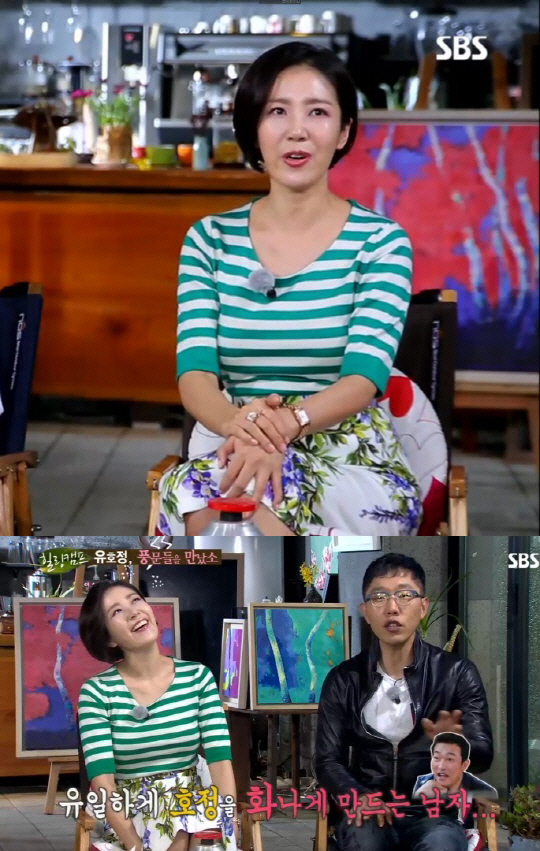 SBS '힐링캠프'의 유호정은 그린 앤 화이트 스트라이프 티셔츠를 선택, 화사한 미모를 더욱 돋보이게 만들었습니다. 공효진과는 달리 팔꿈치정도의 길이와 몸에 딱 달라붙는 핏으로 여성스러운 라인이 강조됩니다. 그녀는 플라워패턴이 가득 그려진 롱 플레어 스커트와 매치하여 우아하고 페미닌한 느낌을 살렸습니다. 최강 동안미모 소유자다운 화사한 모습이네요.