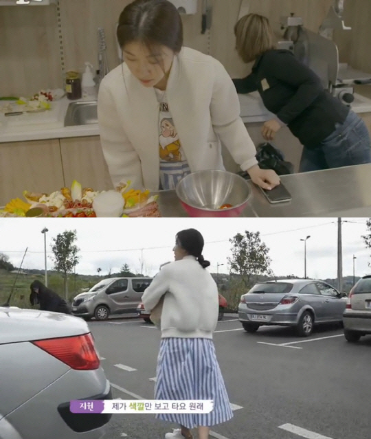 On style '언니랑 고고'에서 하지원은 블루 앤 화이트 조합의 스트라이프 스커트를 선택했습니다. 청량한 색감과 일정하지 않은 스트라이프 방향이 포인트에요. 발목 근처까지 내려오는 길이감과 자연스럽게 흐르는 주름라인에서 발랄하면서도 청순한 느낌이 가득 풍기네요. 그녀는 캐릭터가 그려진 화이트 티셔츠와 매치하여 더욱 소녀스러운 매력을 살렸습니다.