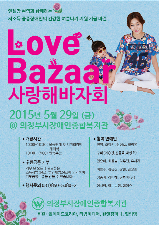 의정부시 장애인 종합복지관(관장 김인숙) 주관으로 29일(금) 오전 10시부터 오후 5시까지 열리는 바자회는 장애인들의 복지 증진 사랑의 기금 마련을 위해 준비된 행사. 평소 재능기부와 보육시설에 보육비 기부로 '엔젤맘'으로 통하는 현영은 특유의 밝고 유쾌함으로 행사 분위기를 띄울 것으로 보인다. 이날 행사에는 현영을 비롯해 조향기, 정성호, 이승광, 추대협, 이영식, 맹승지, 민송아, 최윤슬, 지우린, 유사라, 김유진, 힐링영, 장원, 김상희 등이 참가해 후원 기부물품 판매 및 봉사활동에 참여한다. 또한 장진 감독, 배기성, 이국주, 장동민, 김기리, 홍진호, 김수영, 울랄라세션, 아나운서 이정민, 장영란, 김세아, 안연홍, 조향기, 낸시랭, 이기호 교수 등이 보내온 응원 영상과 스타 애장품 및 자필 사인 CD 기부행사도 펼쳐진다. 이밖에 구피 이승광, 이시향, 리미혜, 박소윤, 전초아, 걸그룹 아는 동생, 에이스 등의 자율 미니콘서트도 열린다.