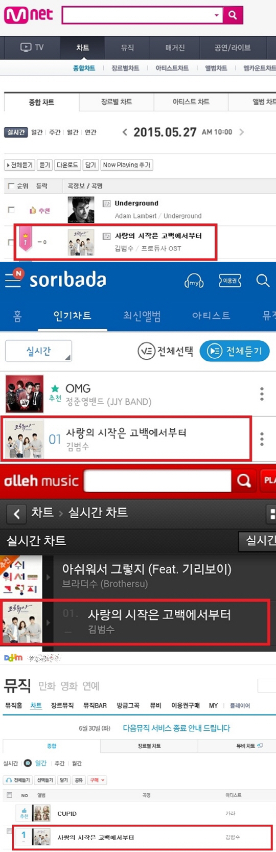 김범수가 부른 '사랑의 시작은 고백에서부터'는 이번 OST 앨범의 타이틀 곡으로, 지난 23일 오후 OST 전체 음원이 공개된 이후 음원사이트 '엠넷', '소리바다', '다음뮤직', '올레뮤직' 4개의 차트에서 1위에 등극, 이외에도 각종 차트에서 상위권에 오르는 저력을 보여주고 있다.