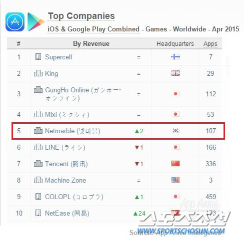 넷마블은 국내 게임사 중 유일하게 10위권 내 이름을 올렸으며, 구글플레이 기록으로는 핀란드 회사 슈퍼셀에 이어 전세계 매출 2위를 기록했다.