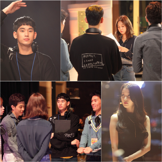 30일 KBS 측은 금토 예능 드라마 '프로듀사' 촬영 스틸을 공개했다. 공개된 사진에는 한 녹화장에 모인 탁예진(공효진) 백승찬(김수현) 신디(아이유)의 모습이 담겼다. 백승찬은 현재 '1박2일' PD로 활동하고 있는 상황. 하지만 이번에는 목에 헤드셋을 착용하고 '뮤직뱅크' 녹화장에서 탁예진의 지시를 기다리고 있어 궁금증을 자아냈다.