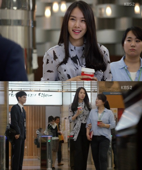 KBS2 '프로듀사'에서 조윤희는 옅은 소라색감이 돋보이는 블라우스를 착용했습니다. 깃털 형상의 블랙 프린팅에서 세련미가 느껴집니다. 같은 컬러의 블랙 와이드팬츠와 매치하여 시크하고 고급스러운 커리어우먼 룩을 연출했습니다. 스카프를 두른 듯한 네크라인 디테일이 포인트입니다. 프로앤자슐러. 140만원대