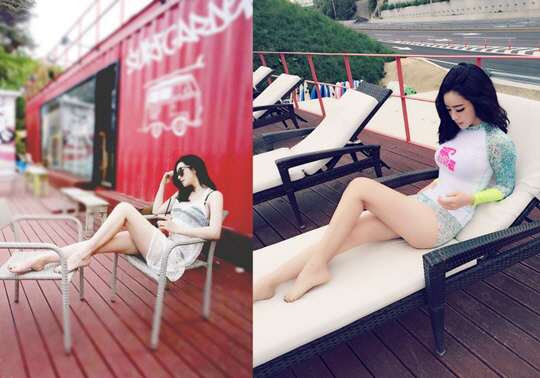 특히 래쉬가드를 착용한 채 쭉 뻗은 각선미를 과시하고 있어 많은 이들의 시선이 집중됐다.